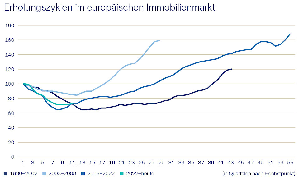 Die Erholung folgt einem typischen historischen Muster. Einzig der aussergewöhnliche «Higher for longer»-Zyklus der frühen 1990er-Jahre brauchte länger, denn er war von anhaltender Inflation und einem Flächenüberangebot geprägt. Aber solche Ungleichgewichte seien heute an fast keinem europäischen Markt in ähnlichem Ausmass zu erkennen. Das spreche für eine schnellere Markterholung im Einklang mit früheren Zyklen.