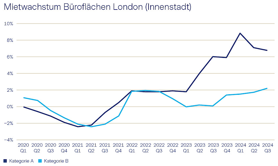 Diese Angebotsbeschränkungen prägten bereits wichtige Marktsegmente. Verstärkt durch die Pandemie, haben sich die Nachfragedynamiken in den Sektoren enorm schnell verändert. Das zeigt sich besonders im Bürosegment. Zwar steige das Gesamtflächenangebot, unter anderem durch flexible Arbeitsmodelle, doch Flächen an zentralen Geschäftslagen seien Mangelware. Überkapazitäten finden sich vor allem in weniger gefragten Lagen und bei veralteten Immobilien. Im vierten Quartal 2024 stiegen die Spitzenmieten für Büros in London, Paris, München, Amsterdam und Frankfurt am Main im zweistelligen Bereich, während das Mietwachstum bei Objekten der Kategorie B verhalten blieb.