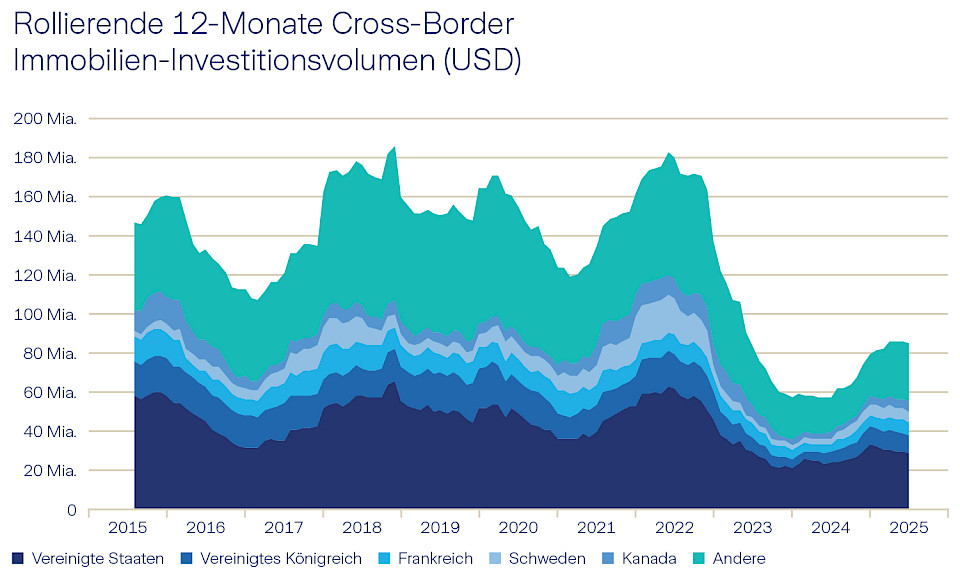 Grenzüberschreitende Investitionen gingen deutlich zurück, als sich die Marktaussichten eintrübten und die Transaktionsaktivitäten abnahmen. Doch internationales Kapital bleibe flexibel. Mit der Verbesserung der Marktbedingungen kehrt es nach Europa zurück – unterstützt durch niedrigere Euro-Swap-Sätze und ein vorteilhaftes Währungsumfeld für US-Dollar-basierte Investoren.