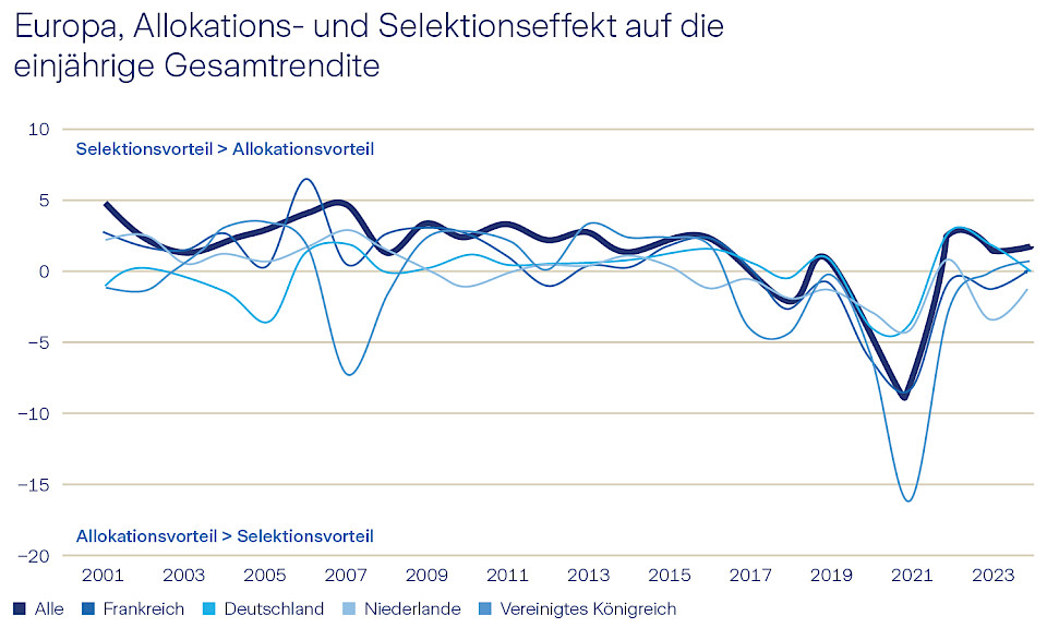 In den vergangenen Jahren hing die Portfolio-Performance in beispiellosem Ausmass von der Sektorallokation ab. Das ändere sich nun. Erfolgreiches Immobilieninvestment beruhte schon immer auf dem richtigen Mix aus Sektor- und Länderallokation sowie der gezielten Auswahl einzelner Objekte. Die Bedeutung der Länderallokation und speziell der Liegenschaftsselektion nehme in der neuen Marktphase wieder deutlich zu. Jetzt gelt es, das Ertragspotenzial bestehender und potenzieller Assets zu erkennen und das Engagement entsprechend zu steuern – und die Allokation auf jene Länder zu optimieren, die ein robustes Wirtschaftswachstum erwarten lassen.