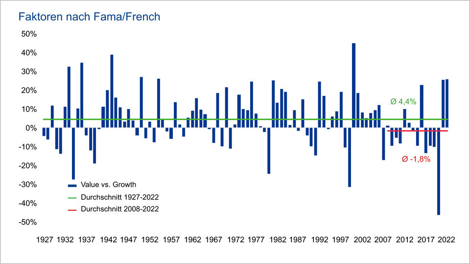 Growth und Value sind zwei Faktoren, denen in wissenschaftlichen Studien Kapitalmarktrelevanz zugeschrieben wird. Prägend ist hier die Arbeit des US-Wirtschafts-Nobelpreisträgers Eugene Fama zusammen mit dem US-Ökonomen Kenneth French. Auch wenn sie keine perfekte Erklärung liefert, so bietet die Unterteilung in Growth- und Value-Aktien doch wertvolle Orientierungshilfe in der Aktienanlage. Die beiden Experten konnten nachweisen, dass historisch am US-Markt der Value-Faktor langfristig eine bessere Wertentwicklung bot als der Growth-Faktor – auch wenn sich das Bild seit der Finanzkrise 2007/08 gedreht hat.