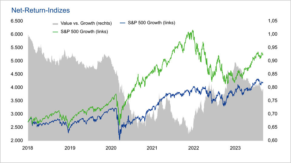 Sollen sich Anlegerinnen und Anleger lieber beispielsweise Aktien von Software- und Halbleiterproduzenten oder Titel von Industrie- oder Energieunternehmen ins Portfolio legen? Klar: Hier geht es um die Frage Growth versus Value. Mit der Einführung des Chatbots ChatGPT und der Euphorie um Künstliche-Intelligenz-Anwendungen (KI) haben wachstumsstarke Technologieaktien seit Ende 2022 deutliche Wertzuwächse verzeichnet.