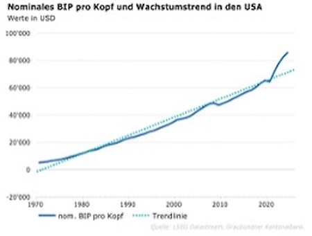 Hier spielt die künstliche Intelligenz als «General Purpose Technology (GPT)» eine Schlüsselrolle. (Mit GPT bezeichnet man eine Technologie, die in diversen Bereichen zur Anwendung kommen kann und die Gesellschaft wie auch die Wirtschaft verändert). Wir gehen davon aus, dass die produktivitätssteigernde Wirkung von KI in führenden Ländern wie den USA in den 2030er Jahren zu jährlichen Wachstumseffekten von bis zu 2 Prozent der Wirtschaftsleistung führen. Bereits jetzt sehen wir Effekte der Produktivitätssteigerungen im Wachstumstrend der USA (vgl. Grafik). Europas Fortschritte sind langsamer, und China muss neben Chancen auch erhebliche Hürden bei der KI-Entwicklung bewältigen.