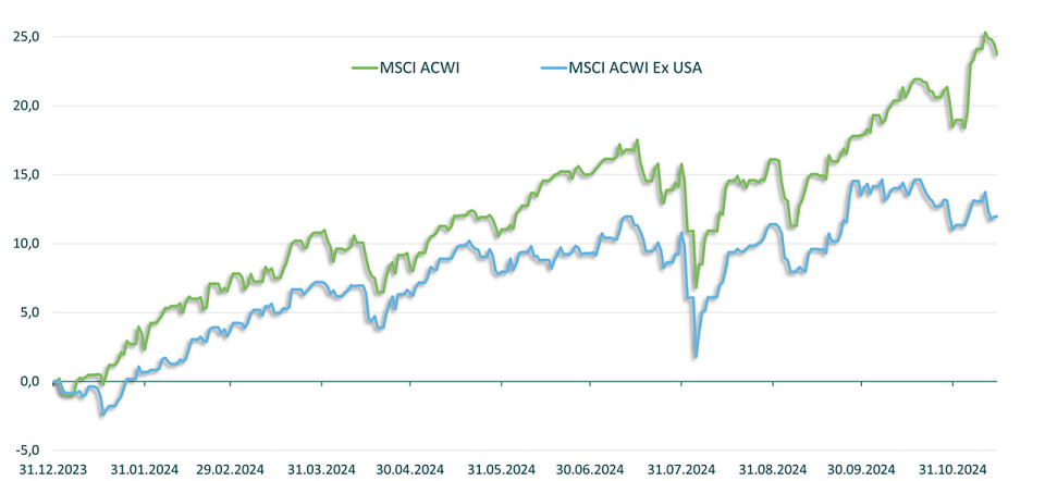 Die Aktienmärkte scheinen sich laut dem Experten «durch nichts aus der Ruhe bringen zu lassen». Der MSCI ACWI Index liegt bis Mitte November über 20 Prozent im Plus. Treibende Kraft ist auch in diesem Jahr wieder der US-Aktienmarkt. So liegen die Aktien ausserhalb der USA – also der MSCI ACWI ex USA Index – «nur» bei einem Plus von 12 Prozent. Besonders auffällig ist das Auseinanderdriften der Wertentwicklung seit Anfang Oktober, was mit den möglichen Nachteilen, die den Handelspartnern der USA aufgrund der erwarteten Anhebung der Zölle durch den neuen US-Präsidenten Donald Trump entstehen könnten, im Zusammenhang steht.