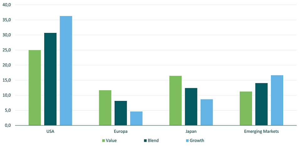 Unterschiedliche regionale Aktienmärkte bieten oftmals unterschiedliche Eigenschaften mit unterschiedlichen Chancen und Risiken. In einem globalen Aktienportfolio sollte man laut Domjanic daher tiefer in die einzelnen Regionen schauen. Dabei kann man letztendlich durchaus zu dem Ergebnis kommen, dass in einer Region Wachstumstitel und in der anderen Region Value-Titel aus unterschiedlichen Gründen interessant erscheinen. «Eine solide globale Aktienallokation ist nicht zwangsweise eine reine Stilfrage zwischen Value und Growth, sondern kann je nach Marktgegebenheit auch eine Kombination aus beidem sein», so das Fazit.