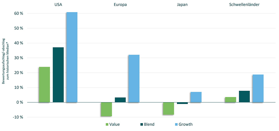 Wachstumstitel sind laut dem Experten überall teuer im Vergleich zur eigenen Historie, besonders teuer erscheinen sie jedoch in den USA (Aufschlag von 62 Prozent!), gefolgt von Europa (Aufschlag von 32 Prozent) und den Emerging Markets (Aufschlag von 19 Prozent). Value-Titel sind dagegen vor allem in Europa (Abschlag von 9 Prozent) und Japan (Abschlag von 8 Prozent) noch immer günstig im Vergleich zur eigenen Historie.