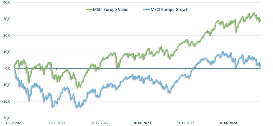 Wie weiter oben gezeigt, profitieren Value-Aktien in Europa derzeit von einem «Rückenwind». Dieser war gemäss Domjanic bereits in den zwei Jahren zuvor zu beobachten. So konnte das Value-Segment in Europa seit dem 1. Januar 2022 kumuliert knapp 30 Prozent an Wert zulegen, während die europäischen Wachstumstitel mit einem Plus von rund einem Prozent in diesem Zeitraum nur sehr knapp im positiven Bereich liegen (jeweils zum 15. November 2024, in Euro).