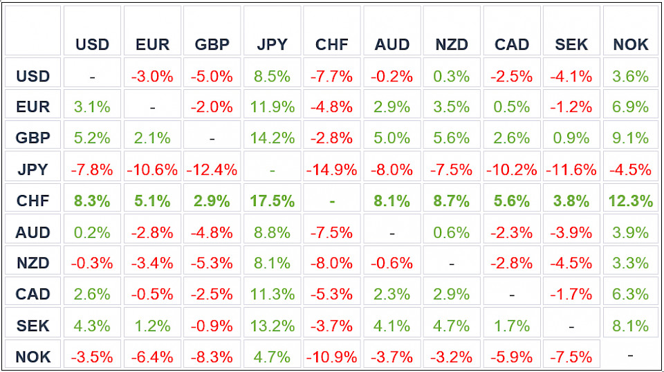 Der Schweizer Franken gewann gegenüber allen wichtigen Währungen 2023 an Wert: Gegenüber dem US-Dollar um +8,3% auf, zum Euro um +5,1% und gegenüber dem britischen Pfund um +2,9%. Noch grösser war der relative Stärkegewinn (+17,5%) gegenüber dem japanischen Yen.