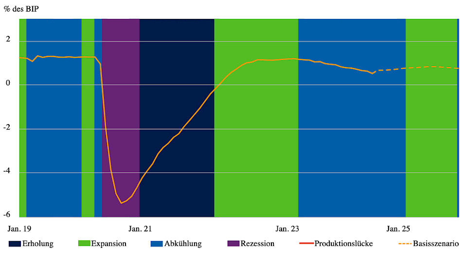Quelle: LSEG DataStream, Schroders Economics Group, 11. November 2024. Das Modell von Schroders zur Produktionslücke bewertet, inwieweit eine Volkswirtschaft unter ihrem vollen Potenzial arbeitet, ohne Inflationsdruck zu erzeugen. Während einer Abkühlung ist die Produktionslücke positiv und sinkt, in der Expansionsphase ist die Produktionslücke positiv und nimmt mit zunehmender Konjunkturbeschleunigung zu.