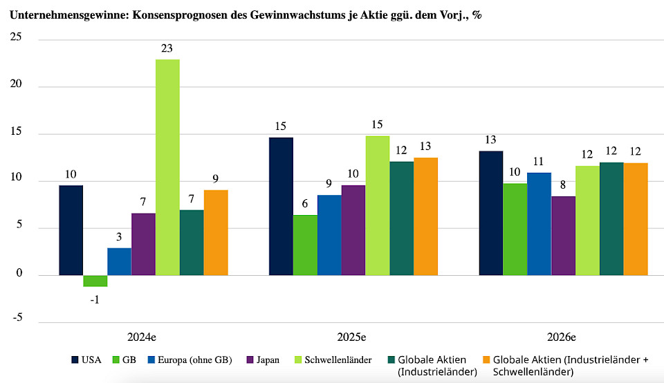 Die enthaltenen Prognosen sind nicht garantiert und sollten nicht als verlässlich angesehen werden. Quelle: LSEG DataStream und Schroders Strategic Research Unit. Daten zum 31. Oktober 2024. Anmerkungen: Der Gewinn pro Aktie in Japan bezieht sich auf 4 Quartale bis zum 30. Juni des nächsten Kalenderjahres, z. B. 2024 = 31.03.2024 – 31.03.2025.