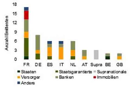 Von insgesamt 79 Emittenten des Green-Bond-Marktes sind 29 Banken und weitere 20 Energieversorger. Dabei sei zu bedenken, dass die Energiewende hohe Investitionen erfordert und das Niedrigzinsniveau auf den Profitabilitätsmargen der Banken laste, so da Costa. 71% der verfügbaren Marktkapitalisierung entfallen auf die fünf grössten Emissionsländer. Die übrigen 29% stammen im Durchschnitt von drei Emittenten pro Land. Aus Deutschland mit einem Anteil von 11% am Green-Bond-Markt das zweitgrösste Emissionsland kommen lediglich acht Emittenten (siehe Abbildung 2). "Der breite EUR-Markt konventioneller Anleihen ist deutlich gleichmässiger strukturiert und lässt daher eine breitere und sinnvollere Diversifikation zu. Auch Investoren von Green-Bond-ETFs kommen um das Problem der starken Konzentration nicht herum", sagt der Portfolio Manager.