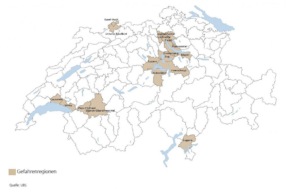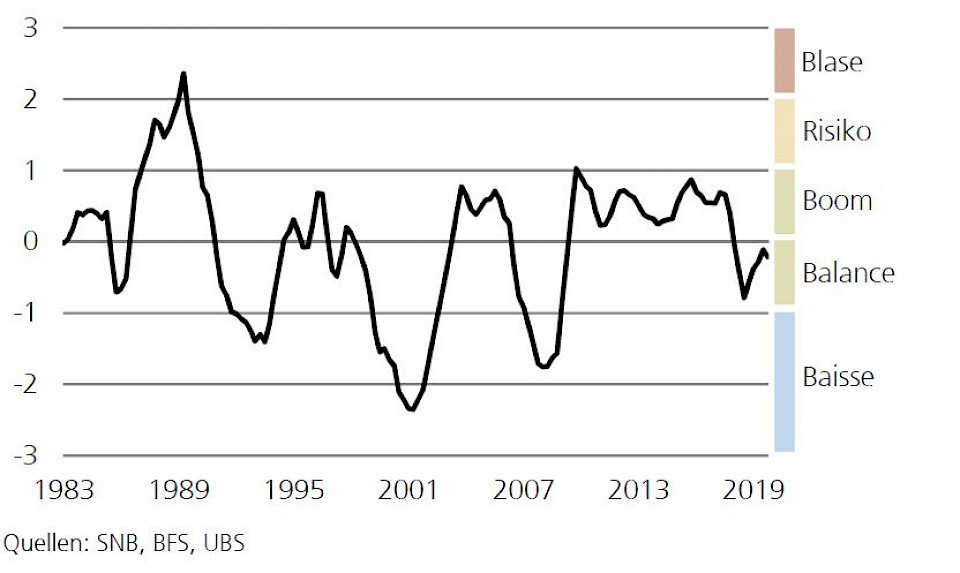 Der UBS Swiss Real Estate Bubble Index misst das Risiko einer Immobilienblase auf dem Schweizer Eigenheimmarkt. Der Index stieg im 4. Quartal 2019 geringfügig an und bewegte sich damit weiterhin ausserhalb der Risikozone. Die Gefahrenregionen bleiben unverändert.