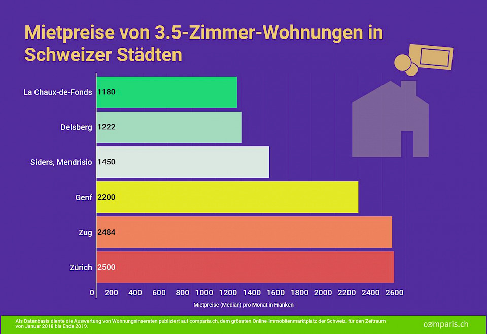 Vor dem Hintergrund der Abstimmung vom kommenden Sonntag über die Initiative "mehr bezahlbare Wohnungen" hat das Vergleichsportal Comparis das Angebotsmietpreisniveau nach Zimmeranzahl (1 bis 6.5 Zimmer) von über 30 Schweizer Städten inklusive Agglomerations-Gemeinden ab 20'000 Einwohnern sowie von ausgewählten kleineren Städten/Gemeinden analysiert. Als Mieter-Paradies hat sich das UNESCO-Welterbe La Chaux-de-Fonds im Kanton Neuenburg herausgestellt. Bei fast allen Wohnungsgrössen ist die Uhrenstadt am günstigsten: So kostet beispielsweise die Miete einer 3.5-Zimmer-Wohnung 1'180 Franken (Median). Zum Vergleich: In Zürich und Zug liegen die Mietpreise mit je rund 2'500 Franken mehr als doppelt so hoch.