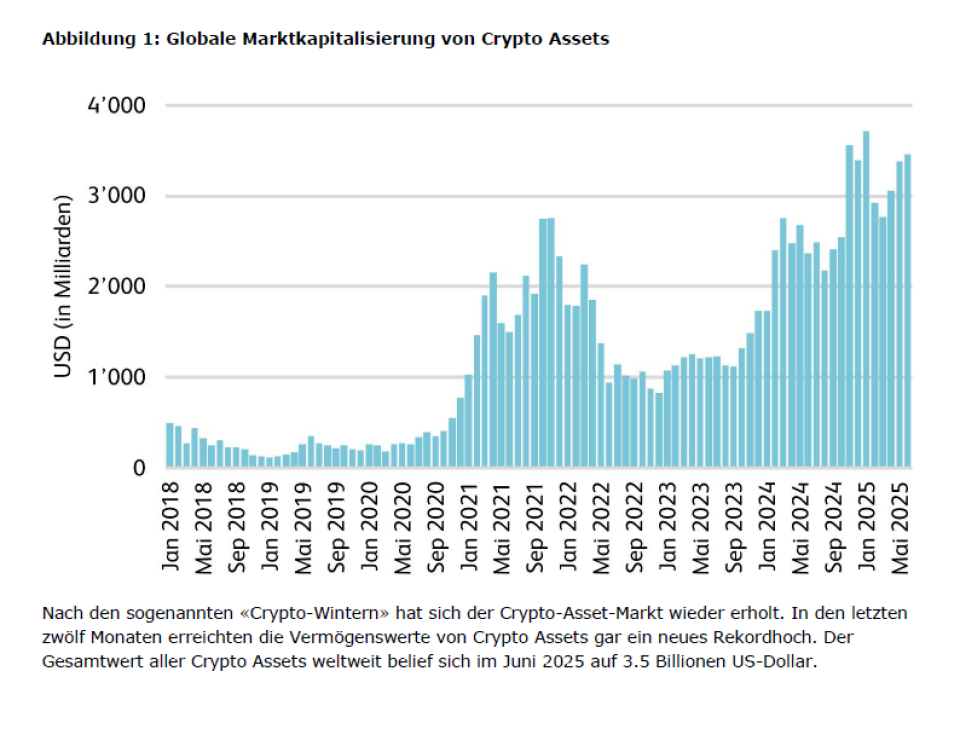 Der Markt für Vermögenswerte auf der Blockchain (Crypto Assets) hat deutlich an Fahrt gewonnen. Mitte 2025 belief sich der Gesamtwert aller Crypto Assets weltweit auf rund 3,5 Bio. Dollar (vgl. Abbildung 1 am Schluss des Artikels).