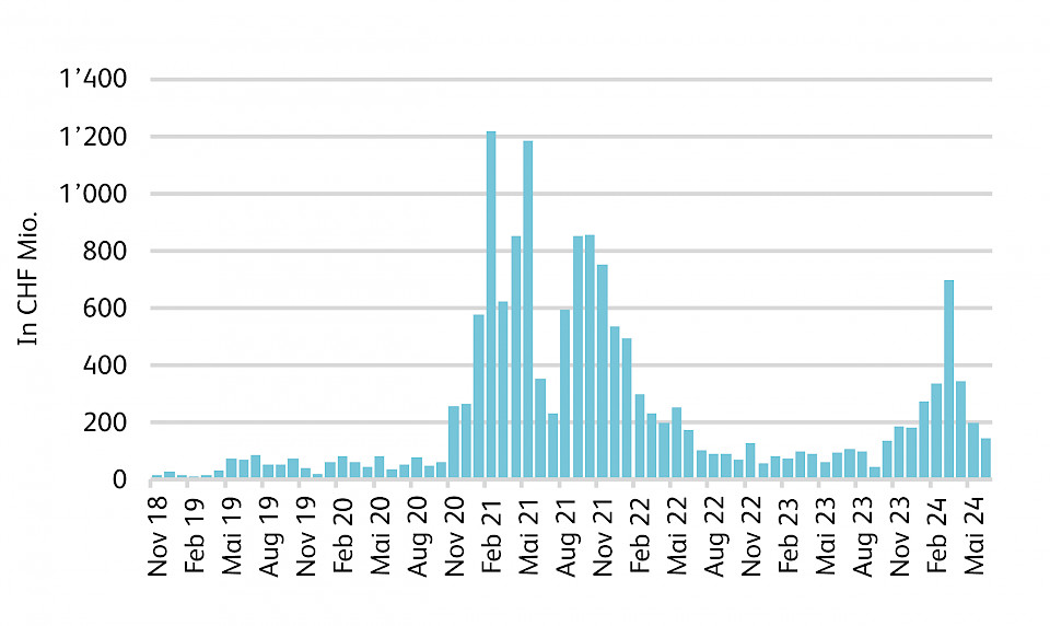 Im ersten Halbjahr 2024 verzeichneten die Handelsvolumina für indirekte Crypto-Produkte an den traditionellen Schweizer Börsen wieder einen Aufwärtstrend, nachdem sie in den Jahren 2022 und 2023 auf einem relativ niedrigen Niveau stagnierten (siehe Abbildung 2). Insgesamt wurden in diesem Zeitraum rund 2 Milliarden Schweizer Franken umgesetzt. Gleichzeitig stiegen auch die Handelsvolumina aus der Schweiz für direkte Investitionen in Crypto Assets über Cryptobörsen.