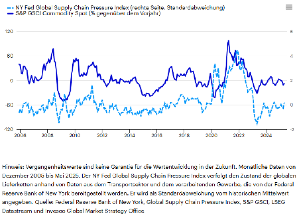 Trotz anhaltender Besorgnis über handelsbedingte Unterbrechungen der Lieferketten hat der Global Supply Chain Pressure Index der New Yorker Fed keine nennenswerten Spannungen angezeigt. Diese Daten, die bis Mai 2025 gelten, könnten laut Invesco noch verzögerte Auswirkungen widerspiegeln. Im Moment schienen die Bedingungen jedoch stabil zu sein.