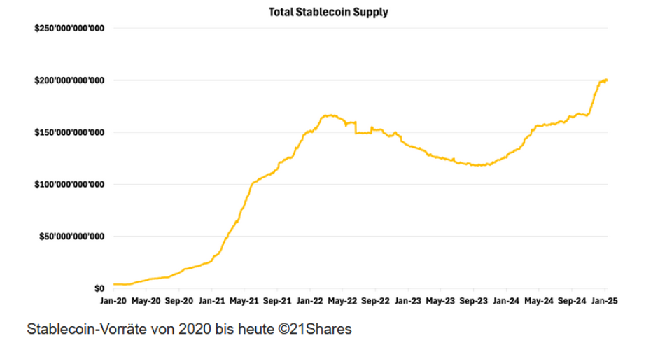 Das verfügbare Stablecoin-Angebot hat ein Allzeithoch von rund 200 Mrd. Dollar erreicht, was darauf hindeute, dass noch eine Menge Kapital darauf warten könnte, auf den Markt geworfen zu werden.