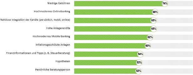 Für fast drei Viertel der Befragten sind niedrige Gebühren der entscheidende Punkt bei der Wahl einer Bank. Nahtlose und hochmoderne Bankdienstleistungen über alle Kanäle – wie Online-Banking, eine mobile Banking-App sind ein weiterer wichtiger Entscheidungsfaktor bei dieser Wahl. Interessanterweise ist die persönliche Beratungsperson nur bei gut 50 Prozent der Kundinnen und Kunden entscheidend.