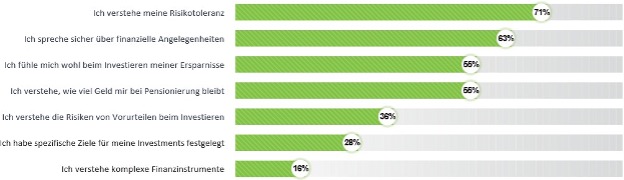 Der Grund für das Desinteresse an aktiver Beratung dürfte also nicht am fehlenden Vertrauen gegenüber den Banken liegen. Es liegt der Schluss nahe, dass dieses Kundensegment sich zum einen von den Banken nicht abgeholt fühlt und zum anderen als ausreichend versiert in Bezug auf die eigene Anlagekompetenz einstuft. 71 Prozent dieser Kundinnen und Kunden sind überzeugt,dass sie einschätzen können, welchen Risikograd sie eingehen sollten. Fast zwei Drittel können nach eigener Einschätzung bei Finanzthemen kompetent mitreden. Mehr als die Hälfte vertraut den eigenen Fähigkeiten, wenn es um die Anlage der eigenen Ersparnisse geht, und glaubt abschätzen zu können, wie viel Geld nach der Pensionierung zur Verfügung stehen wird.