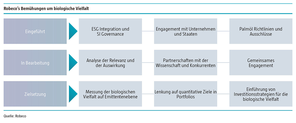 Robeco befasse sich schon seit Jahren mit Fragen der Biodiversität im Rahmen eines speziellen Programms für aktive Einflussnahme, um der Abholzung von Wäldern zur Rohstoffgewinnung entgegenzuwirken. Zudem sei die Einstufung biologischer Vielfalt ein wesentlicher Faktor im ESG-Integrationsprozess von Robeco.