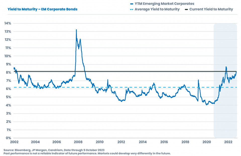Die aktuelle Rendite bis zur Fälligkeit liegt bei Schwellenländeranleihen im Schnitt bei über 8 Prozent. «Es müsste also zu einer erheblichen Ausweitung der Spreads oder deutlich höheren US-Zinsen kommen, um den Carry der Anlageklasse zu verringern. Dies sei eine seltene Gelegenheit, um Renditen zu sichern», schreibt Christopher Mey, CFA – Head of Emerging Market Corporate Credit bei Candriam.