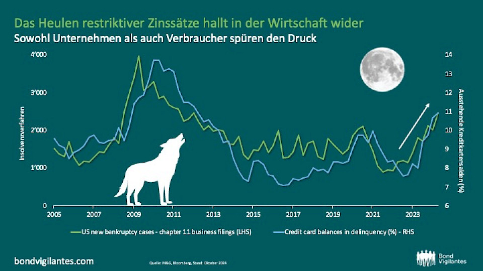 In den USA steigt die Zahl der Insolvenzen nach Chapter 11 stetig an, während die Zahl der Kreditkartenausfälle von über 90 Tagen auf ein Niveau liegt, das zuletzt nach der globalen Finanzkrise verzeichnet wurde. Bis die Geldpolitik deutlich gelockert wird, könnten diese Trends anhalten.