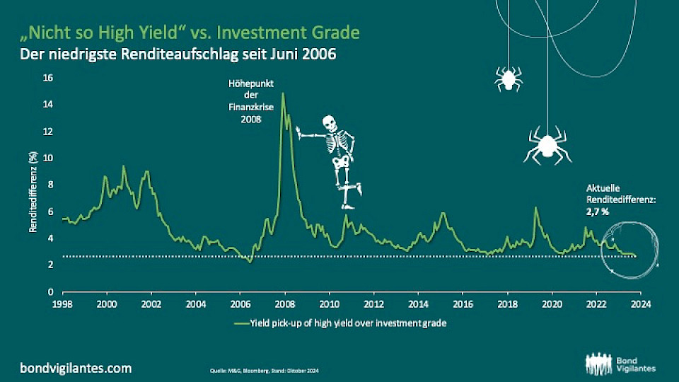 Trotz der beunruhigenden Warnsignale preisen die Kreditmärkte laut M&G nur ein minimales Risiko einer starken Konjunkturverlangsamung ein, ganz zu schweigen von einer Rezession, die die Kreditfundamentaldaten erheblich in Mitleidenschaft ziehen könnte. Tatsächlich ist der Spread zwischen Investment-Grade- und Hochzinsanleihen auf knapp 2,7 Prozent gesunken - den niedrigsten Stand seit 2006. Unterschätzen die Anleger das Potenzial künftiger wirtschaftlicher Turbulenzen?