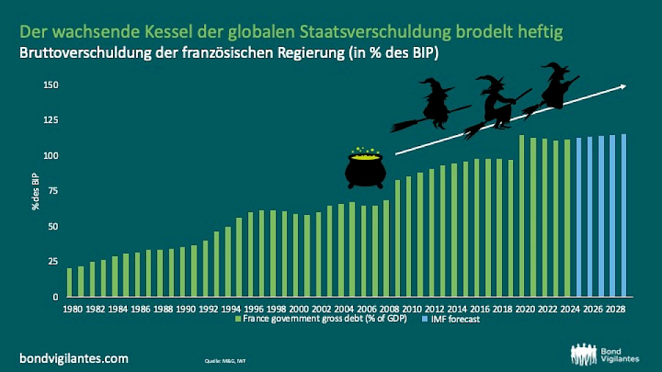 Es ist keine Überraschung, dass die Staatsverschuldung weltweit zunimmt, aber es ist laut M&G wichtig, darauf hinzuweisen, wie besorgniserregend dieser Trend ist. In Frankreich beispielsweise ist die Staatsverschuldung im Verhältnis zum BIP alarmierend hoch. Eine hohe Verschuldung kann sich auf das Wachstum auswirken, da die Staatsausgaben von produktiven Investitionen in den Schuldendienst umgeleitet werden. Sie kann die Zentralbanken auch dazu zwingen, bei Zinserhöhungen fiskalische Risiken zu berücksichtigen, da aggressive Zinserhöhungen die öffentlichen Finanzen destabilisieren könnten.