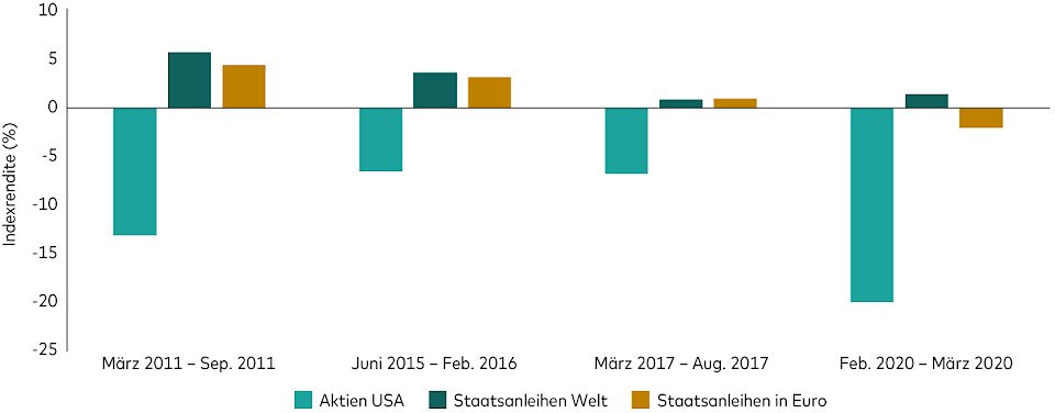 In der Vergangenheit konnten globale Staatsanleihen in Phasen grösserer Kursverluste an den Aktienmärkten Risiken reduzieren und haben in den meisten Fällen zudem eine geringfügig höhere Rendite abgeworfen als Euro-Staatsanleihen.