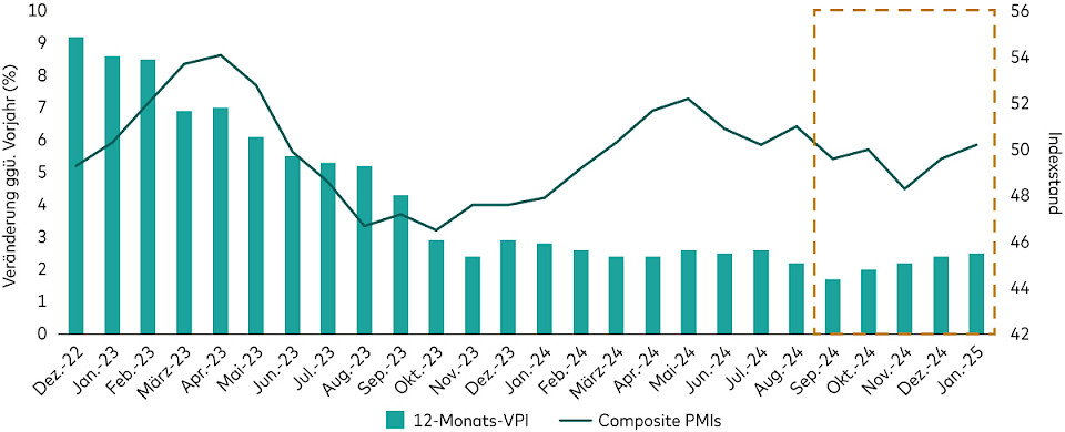 Quelle: Bloomberg. Linke Seite: Kern-Verbraucherpreisindex der Währungsunion von Eurostat (Monetary Union Index of Consumer Prices), ggü. Vj, nicht saisonbereinigt; Daten für den Zeitraum vom 31. Dezember 2022 bis 31. Januar 2025. Rechte Seite: HCOB (Hamburg Commercial Bank) Eurozone Composite PMI SA, Daten für den Zeitraum vom 30. September 2024 bis 31. Januar 2025.