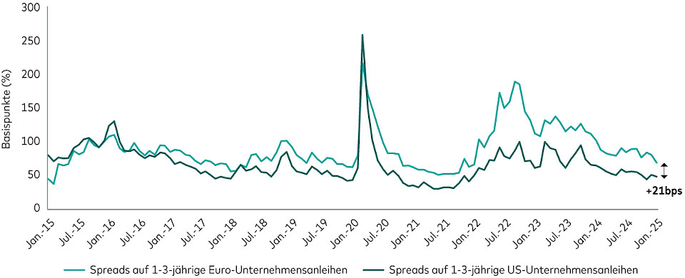 Die Wertentwicklung der Vergangenheit ist kein verlässlicher Indikator für künftige Erträge. Die Wertentwicklung eines Index ist keine exakte Darstellung einer bestimmten Anlage, da Anlegerinnen und Anleger nicht direkt in einen Index investieren können. Quelle: Vanguard; Stand: 31. Januar 2025. Referenzindizes sind der durchschnittliche optionsbereinigte Spread des Bloomberg Euro Corporate 500 1-3Y Index und des Bloomberg US Corporate 1-3 Yr Index.