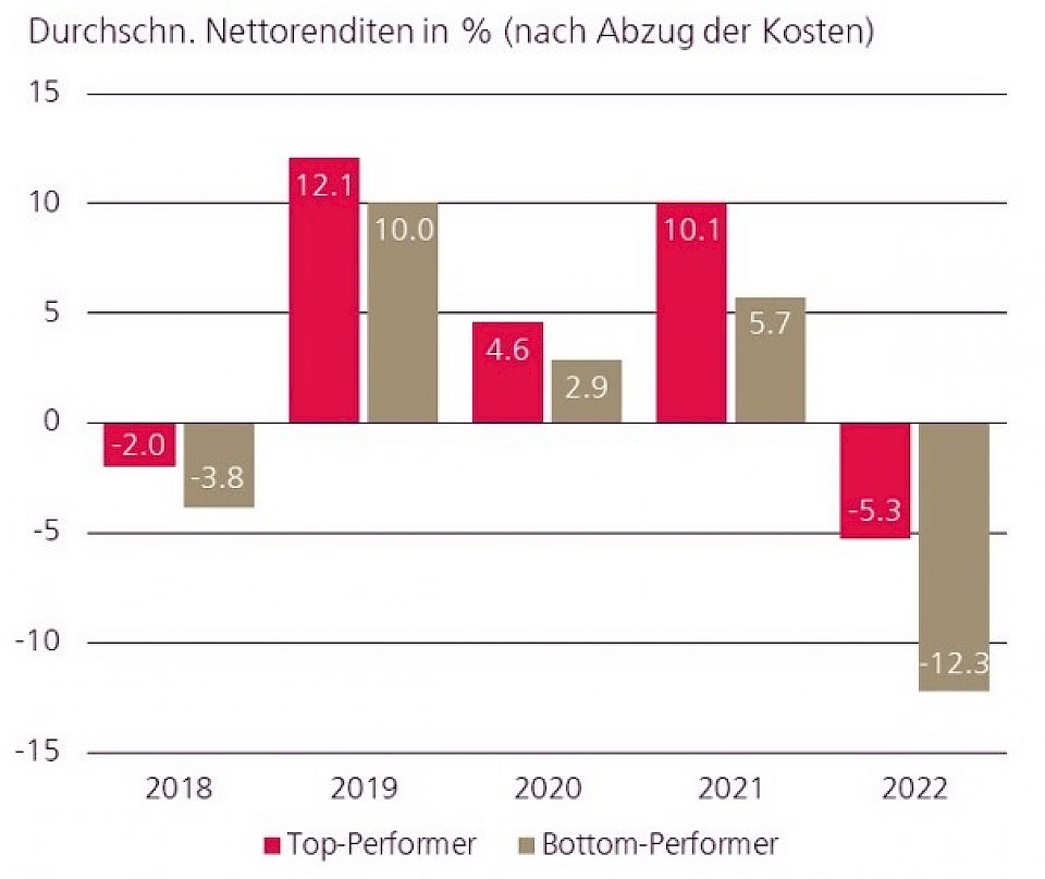 Die detaillierte Auswertung der Top- und Bottom-Performer zeigt, dass die Höhe der Vermögensverwaltungskosten nicht das entscheidende Kriterium für eine gute oder schlechte Nettorendite darstellt. «Tiefere Kosten bringen nicht immer einen Vorteil, ein Verzicht auf teurere Anlageklassen geht zulasten der Diversifikation und reduziert auch potenziell die Gesamtperformance», sagt Iwan Deplazes, Leiter Asset Management der Zürcher Kantonalbank. Vergleicht man jeweils das Zehntel der Kassen miteinander, die in den letzten fünf Jahren die höchsten beziehungsweise tiefsten Nettorenditen erzielt haben, zeigt sich folgendes Bild: Während das beste Zehntel der Kassen zwischen 2018 bis 2022 jährlich 3,7 Prozent erwirtschaftete, erzielte das schlechteste Zehntel der Kassen 0,2 Prozent pro Jahr. Im herausfordernden Jahr 2022 resultierte für die Top-Performer –5,3 Prozent, für die Low-Performer hingegen –12,3 Prozent.