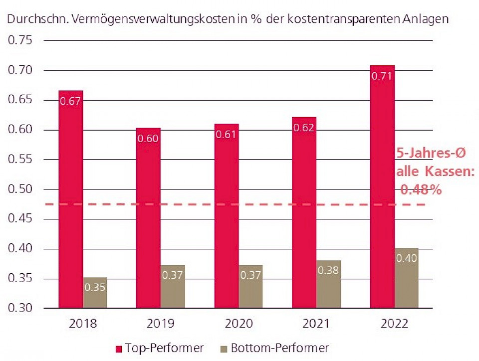 Beim Vergleich der Regionen zeigt sich, dass im 2022 die Deutschschweizer Pensionskassen mit durchschnittlich 0,55 Prozent Vermögensverwaltungskosten günstiger unterwegs waren als ihre Westschweizer Pendants mit 0,69 Prozent. Die höchsten durchschnittlichen Kosten wurden im 2022 im Kanton Genf mit 0,73 Prozent festgestellt, die geringsten im Kanton Bern mit 0,44 Prozent.