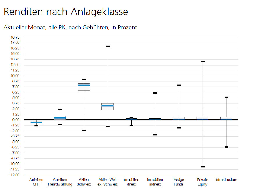 Bei den globalen Aktien liegt der Median im Januar bei gut 3 Prozent. Hier reicht die Spanne von über 16 Prozent Gewinn bis zum Minus von gut 1,5 Prozent. Nochmals etwas grösser sind die Rendite-Differenzen bei den 100 Pensionskassen in Private Equity. Allein im Januar liegen sie zwischen plus 13,3 und minus 10,5 Prozent. Praktisch keine Unterschiede resultierten erwartungsgemäss bei den Anleihen in Schweizer Franken. Hier resultierte im Januar ein kleiner Verlust von 0,6 Prozent.