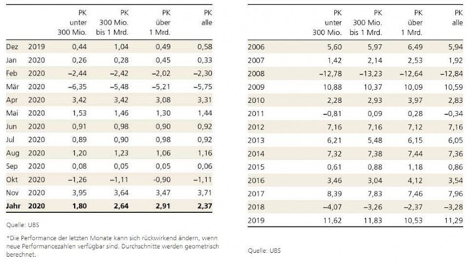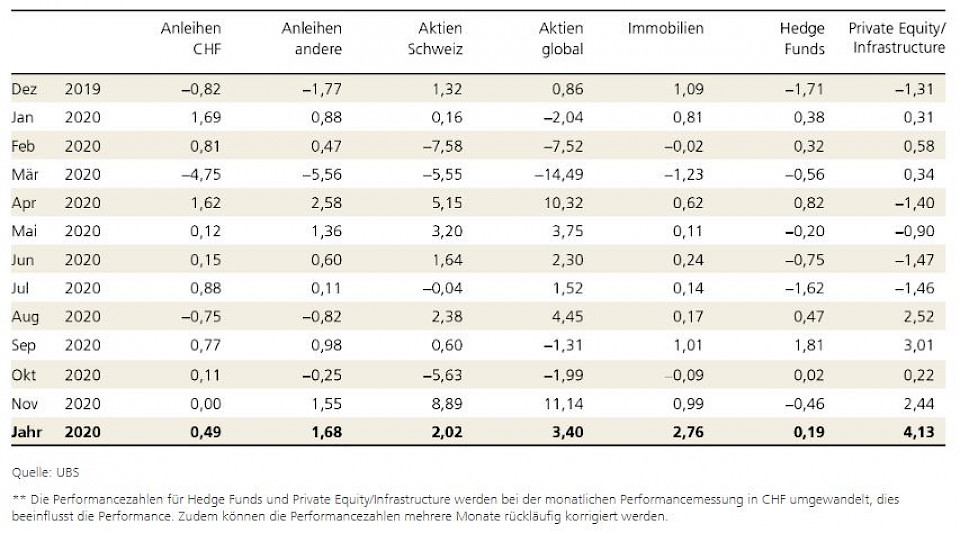 Im November wurden die Märkte vom Ausgang der amerikanischen Präsidentschaftswahl und den positiven Meldungen über baldige Impfungen zu neuen Höhen getrieben. Alle Pensionskassen (PK) verbuchten im letzten Monat einen Gewinn. Das schlechteste Ergebnis von 1,47% erzielte eine grosse Pensionskasse mit mehr als CHF 1 Mrd. verwaltetem Vermögen und das beste Ergebnis von 6,89% eine kleine PK mit weniger als CHF 300 Mio. verwaltetem Vermögen. Durchschnittlich verbuchten die kleinen Vorsorgewerke das beste Monatsresultat mit 3,95%, gefolgt von den mittleren mit 3,64%. Das Schlusslicht bildeten die grossen Pensionskassen mit 3,47%.