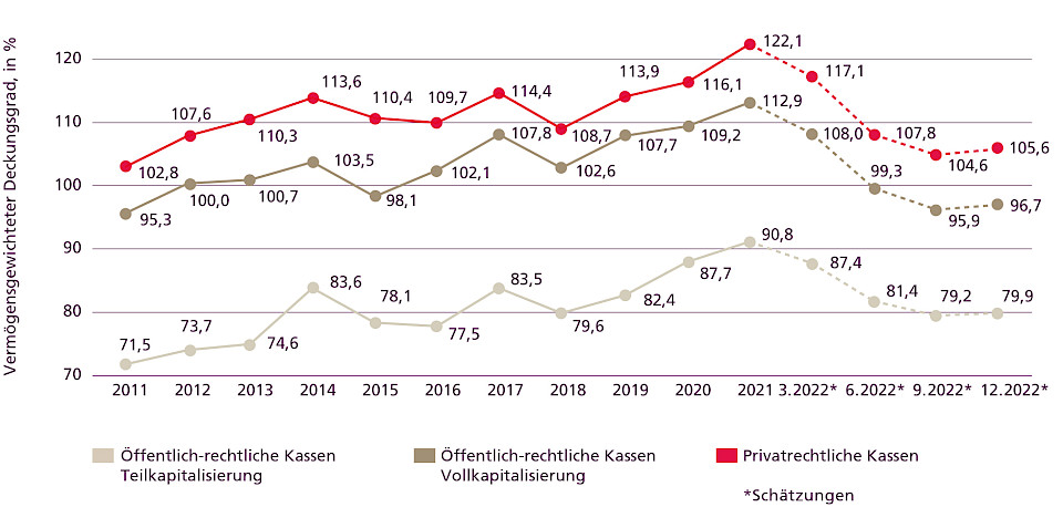Auf das ganze Jahr gesehen kam es durch die letztjährigen Kursbewegungen aber zu einer deutlichen Verschlechterung bei den Deckungsgraden der privatrechtlichen Kassen von 122,1 Prozent auf 105,6 Prozent. Nur noch knapp 21 Prozent der privatrechtlichen Kassen und gut 8 Prozent der öffentlich-rechtlichen Kassen wiesen gemäss der ZKB-Tochter zum Jahresende 2022 eine Deckung von mehr als 115 Prozent auf. Derweil zeigen gut 16 Prozent der privaten, 44 Prozent der öffentlichen Kassen mit Vollkapitalisierung und sogar fast 92 Prozent der öffentlichen Kassen eine Unterdeckung.