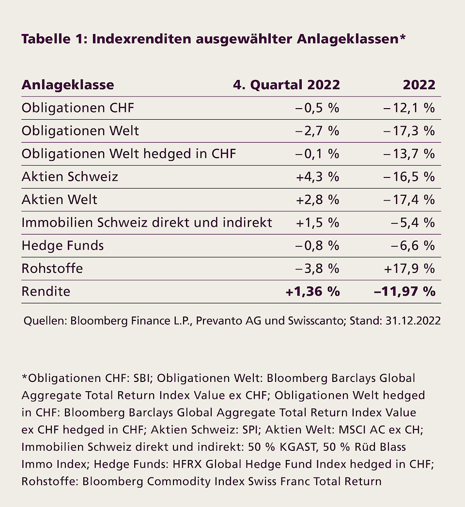 Die einzige Anlageklasse mit einer positiven Rendite von 17,9 Prozent waren im Jahr 2022 die Rohstoffe. Alle anderen Kategorien verzeichneten teils hohe Verluste. So lag beispielsweise die Rendite für Aktien Schweiz bei -16,5 Prozent, Aktien Welt gaben über das Gesamtjahr gar 17,4 Prozent nach. Aber auch Obligationen lagen deutlich im Minus, mit -12,1 Prozent für Obligationen in Franken und -17,3 Prozent bei Obligationen Welt. Vergleichsweise gut hielten sich Immobilien Schweiz mit einem Minus von lediglich 5,4 Prozent.