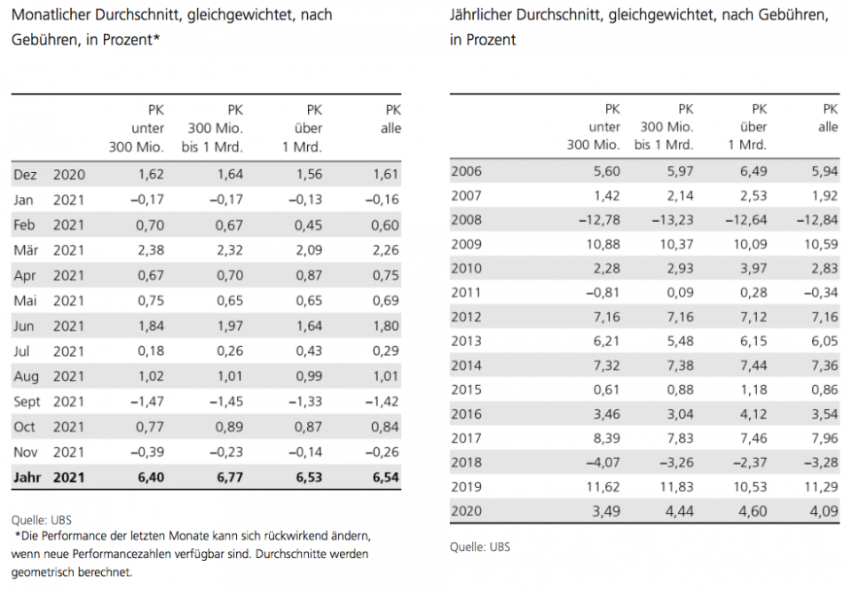 Die Pensionskassen im Sample der UBS erzielten im November insgesamt eine durchschnittliche Performance von -0,26% nach Gebühren. Seit Jahresbeginn erwirtschafteten sie eine Rendite von 6,55% und seit Messbeginn 2006 summiert sich ihre Performance auf 75,11%.