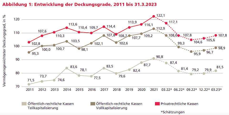 Bei der Deckung der Vorsorgeverpflichtungen ist es durch die Kursbewegungen seit Jahresbeginn zu geringfügigen Verbesserungen gekommen. Inzwischen weisen wieder 27,2 % der privatrechtlichen Kassen (Vorquartal 20,6 %) und 8,3 % der öffentlich-rechtlichen Kassen (zum Vorquartal unverändert) eine Deckung von mehr als 115 % auf.